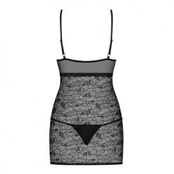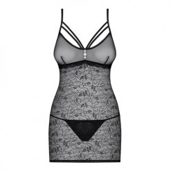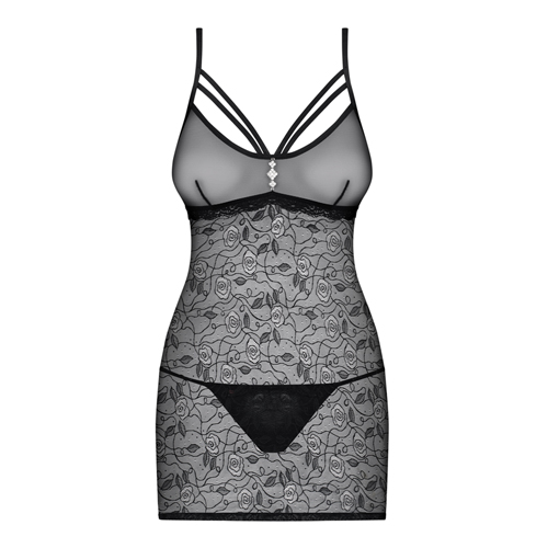 Dit korte nachtjurkje is gemaakt van doorzichtig netstof en heeft een bloemen motief. Het is comfortabel om te dragen en wordt geleverd met een bijpassende string.
