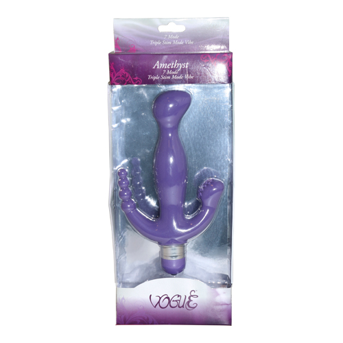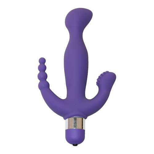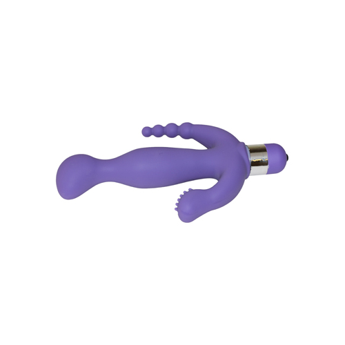 Paarse tarzan vibrator die tegelijk vaginaal en anaal genot geeft en tegelijkertijd de clitoris stimuleert. Met maar liefst 7 krachtige vibratie standen. Het ingenieuze design zorgt voor een stimulatie van de G-spot met de top van de gebogen schaft, plaagt de clitoris met het geribbelde kussentje en geeft anaal genot met de taps toelopende anaal plug. De vibrator is erg flexibel en geeft genoeg stimulaties voor heerlijk genot!