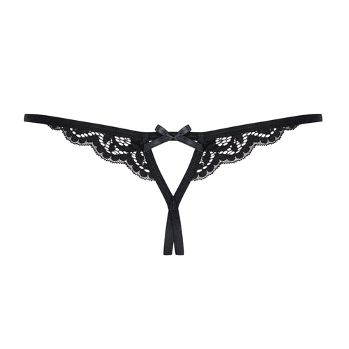 Deze string heeft luxe uitstraling en een open kruisje. Aan de achterkant van het van kant gemaakte kledingstuk vind je een mooi strikje en enkele bandjes. Deze dunne bandjes lopen kruislings over je billen naar de voorzijde. De string is comfortabel te dragen en goed te combineren.